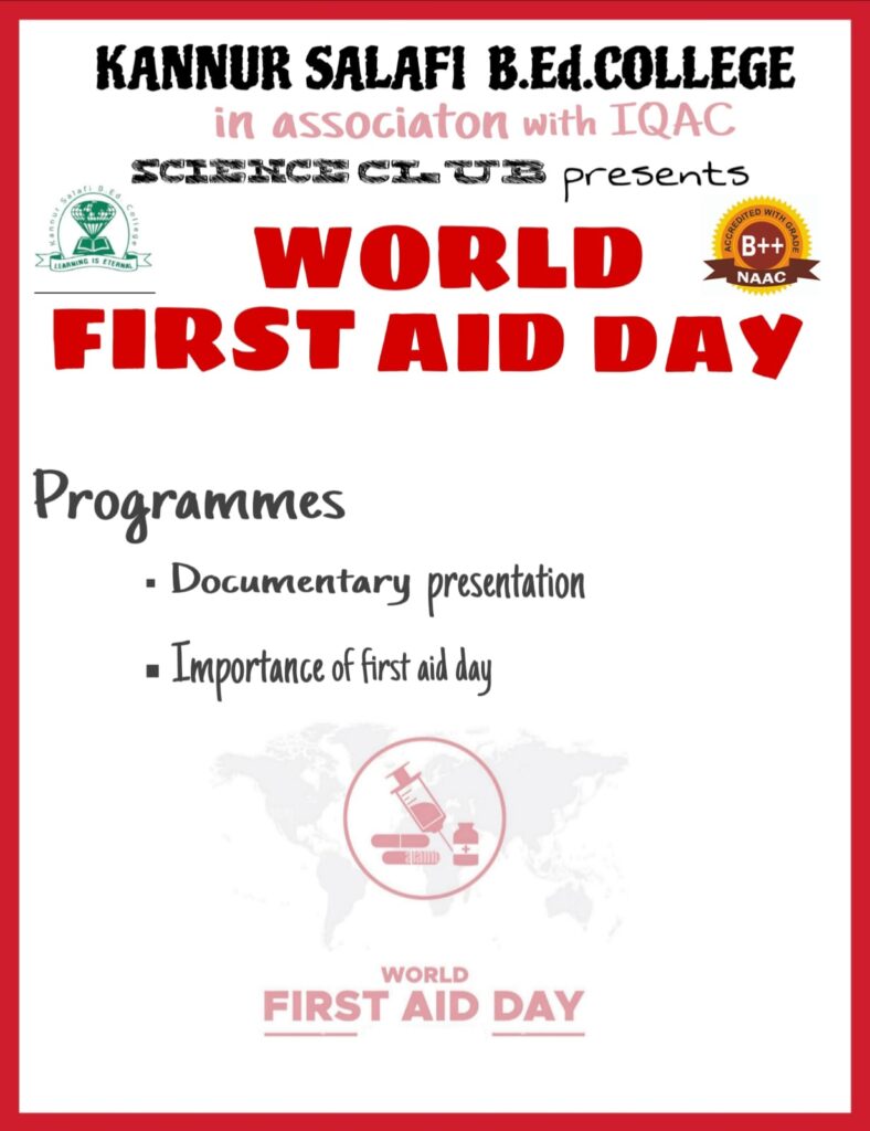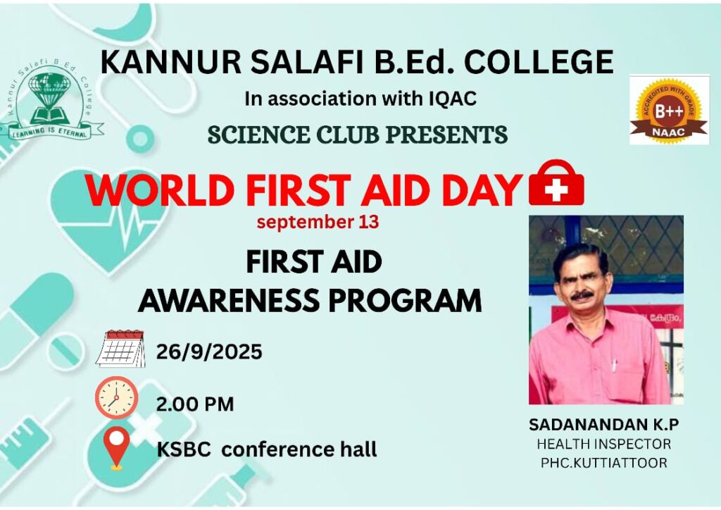 The World First Aid Day celebrations at Kannur Salafi B.Ed. College unfolded through two impactful programs organized in the Science Club, each designed to raise awareness and foster preparedness among students. The first session, held on September 15, 2025, began with an insightful introductory speech by Nizamudheen, who set the tone by highlighting the global relevance of first aid and its essential role in educational spaces. This session featured a documentary presentation and a discussion on the importance of First Aid Day.