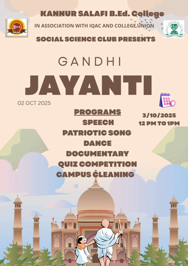 The Social Science Club of Kannur Salafi B.Ed. College organized a Gandhi Jayanthi celebration on October 3, 2025, to honor the ideals and legacy of Mahatma Gandhi. The program commenced at 12:00 p.m. and was anchored by Ms. Nafiya.