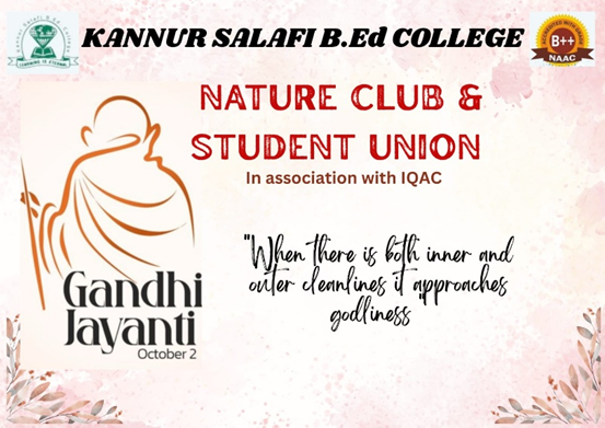 Kannur Salafi B.Ed. College organised a cleaning programme on 3rd October 2025 as part of the observance of Gandhi Jayanthi, which is celebrated on 2nd October every year to honour the ideals of Mahatma Gandhi, particularly his emphasis on cleanliness and community service. The programme was jointly organised by the Nature Club and the College Union under the guidance of faculty members. The main objective of the initiative was to promote environmental awareness, cleanliness, and a sense of civic responsibility among teacher trainees.
