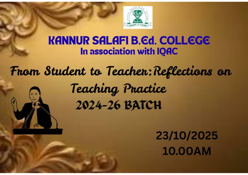Kannur Salafi B.Ed College organized a Feedback/reflection Session for the 2024–26 batch of teacher trainees on 23 October 2025, following the successful completion of their school internship on 22 October 2025. The session aimed to provide a platform for student teachers to share their experiences, reflections, and learning outcomes from the internship program.