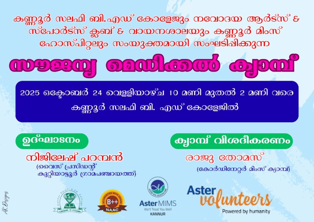 Kannur Salafi B.Ed. College organized a Medical Camp in association with Navodaya Arts and Sports Club, Vayanashala, and Kannur MIMS Hospital on 24th October 2025 at the college campus. The event was aimed at promoting health awareness and providing free medical check-ups for the nearby community. The camp witnessed enthusiastic participation from several residents of Kuttiyattoor Grama Panchayath and neighboring areas. The program began at 10:00 a.m. with an inaugural function held in the college auditorium. The session was formally inaugurated by Mr. Nijilesh Paramban, Vice President of Kuttiyattoor Grama Panchayath. In his inaugural address, he appreciated the efforts of the college and the collaborating organizations for their commitment to community welfare.