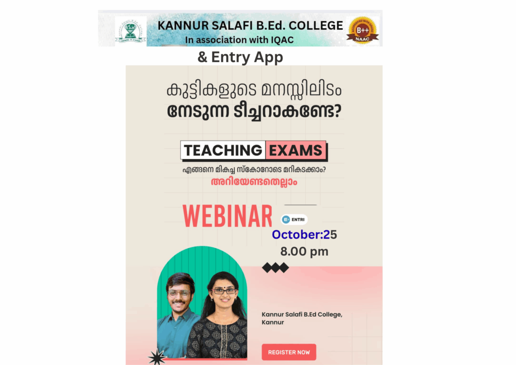 On October 25th, 2025, Kannur Salafi B.Ed College, in collaboration with ENTRY APP, organized a webinar focused on Kerala Teacher Eligibility Test (KTET) Orientation State Eligibility Test (SET) . The webinar aimed to provide valuable insights and guidance to students preparing for the KTET , SET & CTET examination.