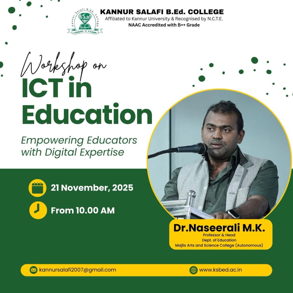 Kannur Salafi B.Ed College organized an ICT Workshop for the 2024–25 batch as part of enhancing the digital competency of prospective teachers. The session aimed to familiarize student teachers with the significance of Information and Communication Technology (ICT) in the contemporary educational landscape and to equip them with practical skills for effective classroom application.