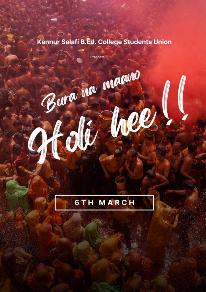 The vibrant festival of Holi was celebrated with great enthusiasm at Kannur Salafi B.Ed. College on 6 March 2026. The celebration aimed to promote cultural harmony, joy, and unity among the students and faculty members.
