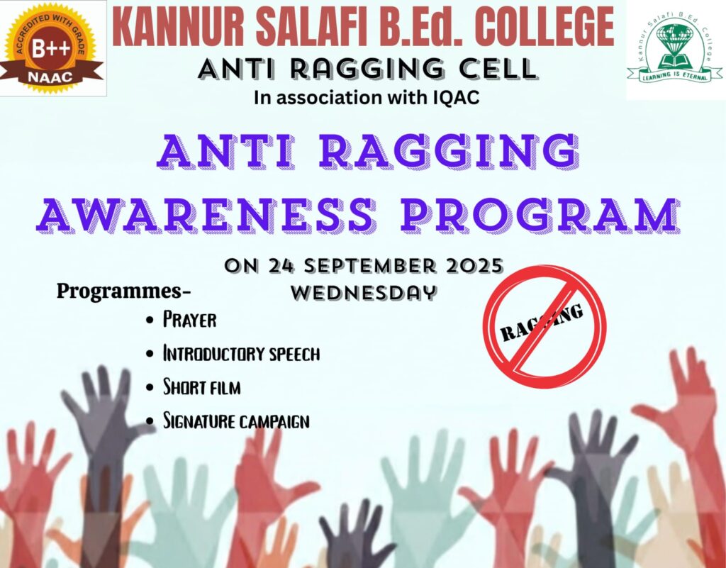 Kannur Salafi B.Ed College, committed to fostering a safe and conducive learning environment, has taken a significant step towards ensuring the well-being of its students by establishing an Anti-Ragging Cell.